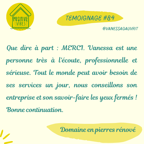 " Que dire à part : MERCI. Vanessa est une personne très à l'écoute, professionnelle et sérieuse. Tout le monde peut avoir besoin de ses services un jour, nous conseillons son entreprise et son savoir-faire les yeux fermés ! Bonne continuation "